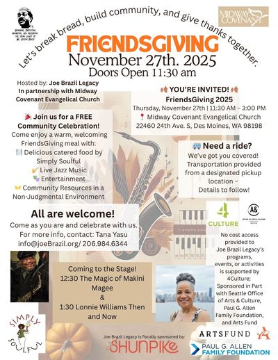 Thursday November 27th. 2025 11:30 am. - 3 pm We're gathering at Midway Covenant Evangelical Church, 22460 24th. Ave. S, Des Moines WA 98198 to gather with community for a FriendsGiving meal.